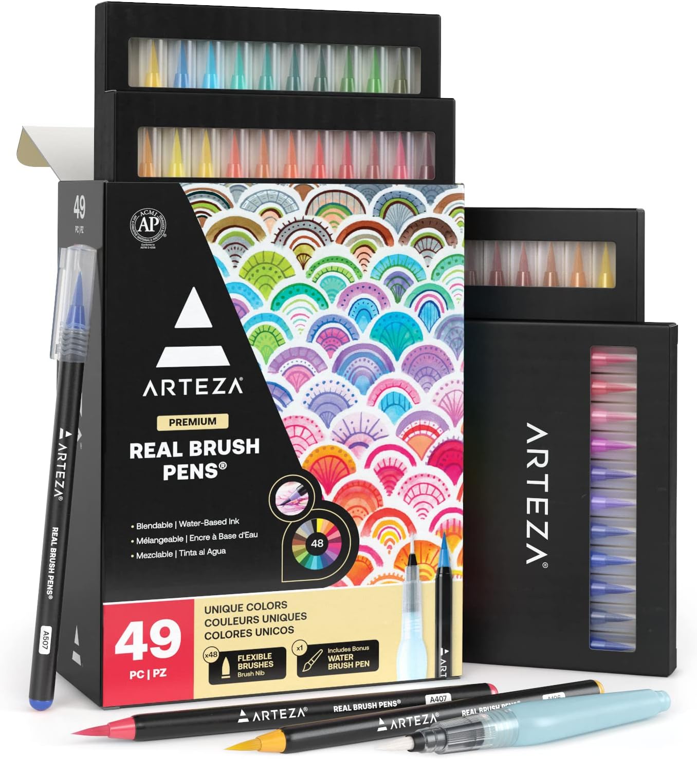 ARTEZA Real Brush Pens, 48 Watercolor Pens, Drawing Markers with Flexible Brush Tips, Watercolor Markers for Artists, and Beginners
